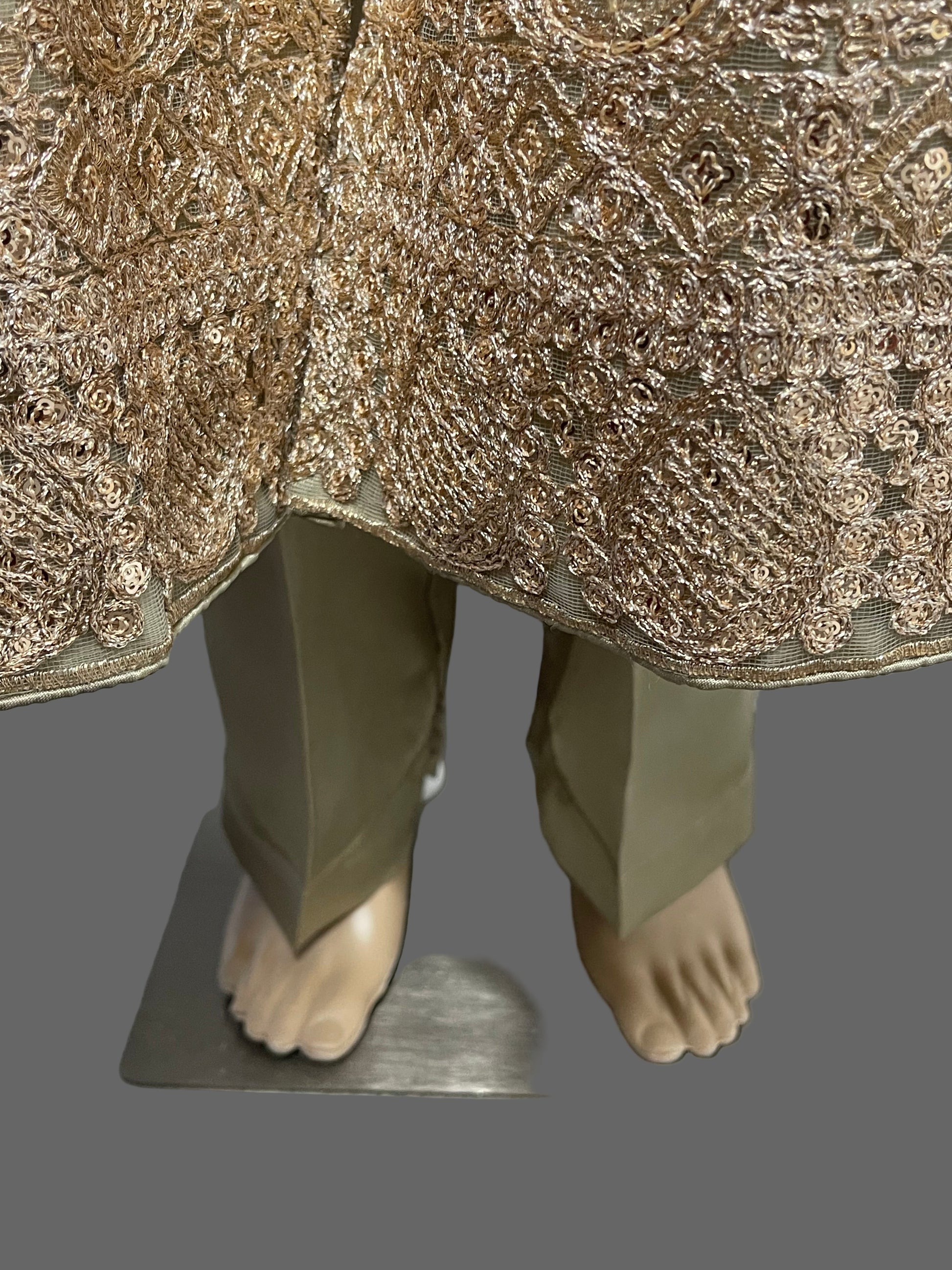 A "golden marori work with sequins and resham dress with full flare" is a luxurious garment embellished with intricate golden thread embroidery, shimmering sequins, and silk thread creatin a radiant look. This beautiful dress has and perfect for wedding, festivals, and special occasions.